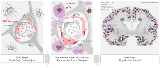 Progression of neurovascular–perivascular and parenchymal brain changes in AD. Blood–brain barrier (BBB) damage and infiltration of serum and blood cellular elements occur in prodromal, i.e., early-stage AD (left panel). Vascular and/or inflammatory insults may further induce transudates in perivascular spaces, impede interstitial fluid drainage, and cause impaired nutrient exchange, edema, cytokine and metabolic waste accumulation, and reactive inflammation and dysregulation (middle panel). In later stages of disease, extracellular βA plaques and intraneuronal neurofibrillary tangles, as well as other protein inclusions, are frequent and are associated with progressive cognitive impairment (right panel).