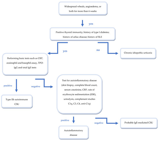 The international EAACI/GA2LEN/EuroGuiDerm/APAAACI guideline for the definition, classification, diagnosis, and management of urticaria [28], published in March 2022, reports that it is well known that causes of CSU include autoimmunity type I (CSU)aiTI, or “autoallergic CSU”; with IgE autoantibodies against autoantigens and type IIb autoimmunity (CSU)aiTIIb; with activating autoantibodies directed by mast cells. In the diagnostic process, the patient’s history and a physical exam can provide clues to the underlying causes. For this purpose, the execution of basic tests, such as CRP (more often elevated) and the dosage of eosinophils and basophils (more often reduced in CSUaiTIIb), is of primary importance. Testing for TPO-IgG and total IgE should also be performed in CSU patients in specialist care, as they are useful for diagnostic purposes. CSUaiTIIb patients are more likely to have low or very low total IgE and elevated anti-TPO IgG levels, and a high ratio of anti-TPO IgG to total IgE is currently the best surrogate marker for CSUaiTIIb. Other underlying causes include active thyroid disease, infections, inflammatory processes, food and medications. In CSU, the most common comorbidities are CIndUs, autoimmune diseases, and allergies. Findings from the patient’s medical history, a physical exam, or baseline tests that indicate a comorbidity or consequence of CSU should prompt further investigation, such as screening for specific diseases by means of questionnaires, provocation tests, further laboratory tests, or referral to a specialist.