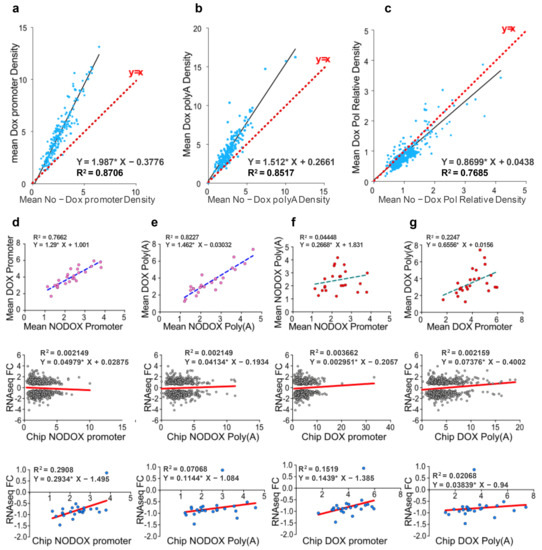 This trend was also present in the Muhar signature of MYC target genes (Figure 5d–g), with higher values of RNAPII density at promoters and terminators in DOX-treated cells. As to mRNA expression levels, Muhar signature genes were significantly down-regulated by Omomyc induction. The correlation analysis for all MYC target genes (Figure 5, third row) did not show a strong link between mRNA expression changes and RNAPII occupancy.