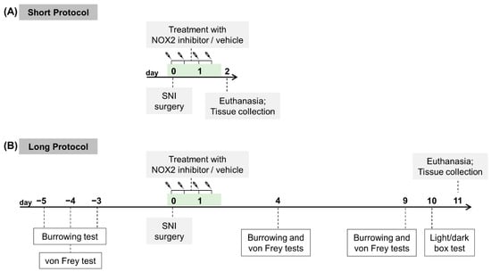 Schematic representation of the experimental design. Male and female mice were randomly allocated within sex to short (A) or long (B) protocol, and then to SNI-NOX2i or SNI-vehicle groups. NOX2 inhibitor (NOX2i) or vehicle solutions were subcutaneously administered, twice daily, for 2 days, starting 1 h before the spared nerve injury (SNI) surgery. SNI surgery day was set as day 0. Mice from the short protocol were euthanized on day 2, whereas mice from the long protocol were euthanized on day 11. Only the latter underwent behavioral testing.