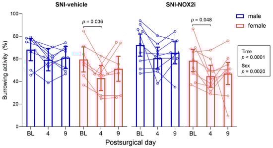 In the burrowing test, the mixed model analysis revealed a main effect of sex (F(1, 30) = 11.41, p = 0.0020), with males burrowing more extensively than females, independently of the treatment group or the testing day, and time (F(2, 60) = 12.81, p < 0.0001) (Figure 2). The burrowing activity decreased after surgery in most male and female SNI animals on day 4 (although this reduction was only statistically significant in females; ♀-SNI-veh: BL vs. day 4, p = 0.036; ♀-SNI-NOX2i: BL vs. day 4, p = 0.048), but not on day 9 (Figure 2). Therefore, SNI surgery affected, at short term, the motivation of mice (particularly females) to engage in a voluntary activity not essential in the laboratory environment.