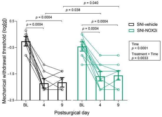 To assess whether NOX2i treatment influenced SNI-induced mechanical hypersensitivity, we evaluated the MWT of the ipsilateral paw before surgery and on days 4 and 9. Since no differences between sexes were detected, the final analysis did not include Sex factor (as described in Section 2.8; Table S1). Although the mixed model analysis revealed no main effects of treatment (F(1, 21) = 1.49, p = 0.24), both time (F(2, 50) = 217.7, p < 0.0001) and treatment by time interaction (F(2, 50) = 6.42, p = 0.0033) were statistically significant. No significant differences were observed between groups at baseline (SNI-NOX2i vs. SNI-veh, p = 0.12). After surgery, SNI animals developed mechanical hypersensitivity, as confirmed by the decrease in MWT on days 4 and 9, compared to baseline (SNI-veh: BL vs. day 4, p = 0.0004; SNI-veh: BL vs. day 9, p = 0.0004; SNI-NOX2i: BL vs. day 4, p = 0.0004; SNI-NOX2i: BL vs. day 9, p = 0.0004; Figure 3). When compared to vehicle-treated mice, treatment with NOX2i increased MWT by 14.3% on day 4 (p = 0.038, NOX2i-treated vs. vehicle-treated mice; Figure 3), and by 14.4% on day 9 (p = 0.040, NOX2i-treated vs. vehicle-treated mice; Figure 3).