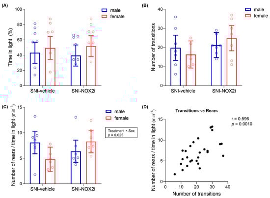 Effects of NOX2i treatment on the anxiety-like behavior after spared nerve injury (SNI), in the light/dark box (LDB) test, on day 10. NOX2i treatment affected neither the time spent (%) in the light chamber (A) nor the number of full-body transitions between light and dark chambers (B). The number of rearing events in the light chamber standardized by the duration of time spent in that chamber (C) was differently affected by NOX2i treatment in male and female mice. A positive correlation was found between the number of transitions and the standardized number of rears in the light chamber (D). For panels A to C, data were analyzed with single-measures ANOVA, with factors treatment and sex. Holm’s procedure was used to correct for multiple comparisons. Individual values and mean predicted values (95% CI) from the analysis are presented. p-values for statistically significant main effects/interactions and planned comparisons are shown. ♂-SNI-NOX2i, n = 7; ♂-SNI-veh, n = 7; ♀-SNI-NOX2i, n = 7; ♀ -SNI-veh, n = 6. For panel D, Pearson’s correlation coefficient analysis included all SNI animals (N = 27).