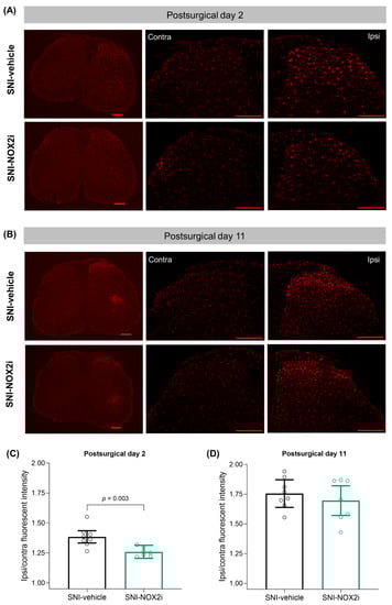 To investigate putative mechanisms underlying the NOX2i effects, the immunoreactivity of Iba-1 was evaluated on the SC dorsal horns collected on days 2 and 11. Although the fact that Iba-1 is a pan-myeloid marker should be acknowledged, Iba-1 is still a reliable microglial marker and has been the most widely-used marker for microglial activation in NP models [,].