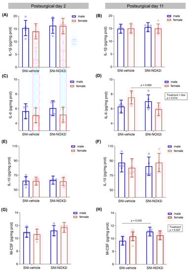 Two days after surgery, no statistically-significant differences between NOX2i- and vehicle-treated male and female mice were found in any of the analyzed cytokines (largest F = 3.39, p = 0.090, for the Treatment factor in M-CSF, see Table S1; Figure 6A,C,E,G).