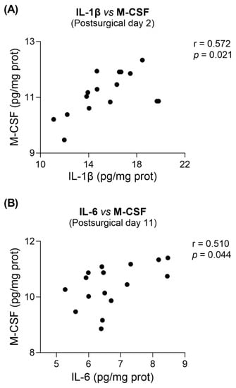Positive correlations between IL-β and M-CSF were found at postsurgical day 2 (A), and between IL-6 and M-CSF at postsurgical day 11 (B). Pearson’s correlation coefficient analyses included all animals (Day 2: N = 16. Day 11: N = 16).