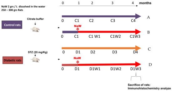 We used male Sprague-Dawley (SD) rats weighing 200–250 g. For the induction of diabetes, rats were injected with 55 mg/kg of STZ intravenously (caudal vein), dissolved in 1 mL of autoclaved and filtered (0.2 µm) 10 mM sodium citrate, 0.9% NaCl, pH 4.5. 2 weeks after injection we confirmed the induction of diabetes. We split the animals into two groups. One group of diabetic animals was maintained for 4 months. The second group of diabetic animals was treated with NaW. In the second month post-diabetes induction, the rats were given a solution of 0.7 g/L of NaW in water ad libitum for two weeks. The dose was increased to 2 g/from the third week until the fourth month. In parallel, there was a control group without treatment and a control group treated with NaW, previously injected only with the vehicle (sodium citrate) (Figure 1).