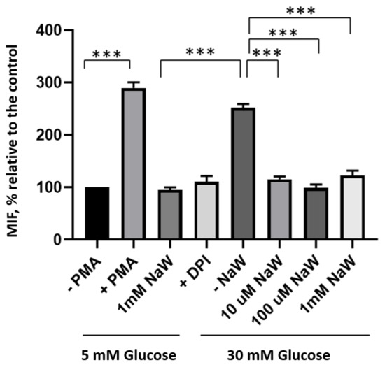 Cells were cultured with 5 mM or 30 mM glucose in the presence or absence of NaW or pre-treated for 30 min with 10 nM diphenyleneiodonium (DPI), an NADPH oxidase inhibitor. Subsequently, the cells were incubated with the fluorescent probe dichlorofluorescein (DCF) for 15 min at 37 °C, and fluorescence intensity was measured by flow cytometry. As a positive control, the cells were incubated for 15 min with phorbol-myristate-acetate (PMA).