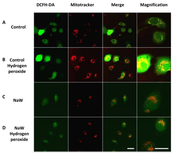 Effect of Sodium Tungstate at the mitochondrial level on ROS production in HK-2 cells cultured with H2O2. In vivo fluorescence for ROS observation in HK-2 cells cultured in low glucose 5.5 mM glucose at mitochondrial level (red) and cytosolic ROS (green): (A) Control cells. (B) Induced with 500 µM H2O2. (C) Cells treated with NaW. (D) Cells treated with NaW induced with H2O2. The probe used for ROS measurement is DCFH-DA 10 μM incubated for 30 min, while for mitochondria labeling, used MitoTracker 100 nM probe was incubated for 15 min. The magnification bar indicates 10 μm.