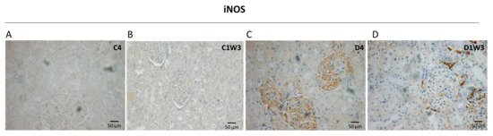 Effect of Sodium Tungstate on iNOS expression in diabetic rats. Location iNOS in glomeruli and tubular cells in the cortex. (A) healthy control rats (C4), (B) NaW-treated control rats (C1W3), (C) diabetic rats (D4), and (D) NaW-treated diabetic rats (D1W3). The values represent the mean ± standard error of the total number of animals per group. The scale bar indicates 50 µm.