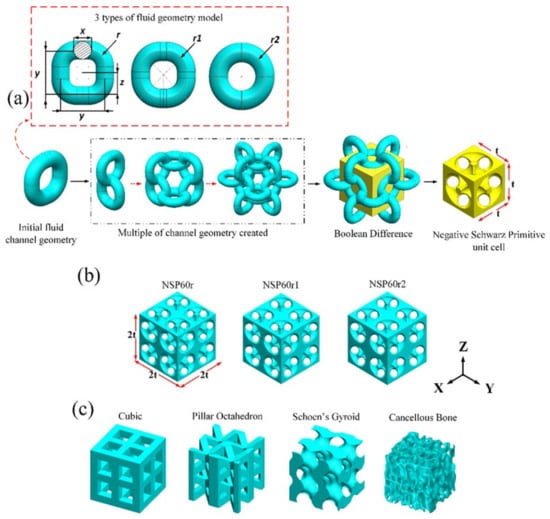 In this study, the scaffold is an open porous model with tortuous microchannels made with SolidWorks (Dassault Systèmes SolidWorks Corp., Waltham, MA, USA) software. A schematic illustration of the scaffold design stage is shown in Figure 1a. The first step is to determine the shape of the pores. It is carried out by using the idea of a meandering pore channel with different radiuses of curvature of 0.4 mm, 0.45 mm, and 0.49 mm. A Boolean subtraction function can also be used to make a new unit cell called Negative Schwarz Primitive (NSP), which has main dimensions of 2.1 mm for width, 2.1 mm for height, and 2.1 mm for length. In the last step, the individual cells are assembled to make a model bone scaffold with tortuous microchannels. Each NSP scaffold geometry was labeled according to NSP with 60% porosity and curvature of 0.4, 0.45, and 0.49 mm. Each label is assigned as NSP60r, NSP60r1, and NSP60r2 (see Figure 1b). Next, the scaffold’s porosity is changed to the required value by modifying the pore size (X). The cubic, PO, SG, and natural cancellous bone models with 60% porosity are shown in Figure 1c. A summary of bone scaffold porosity data is shown in Table 1.