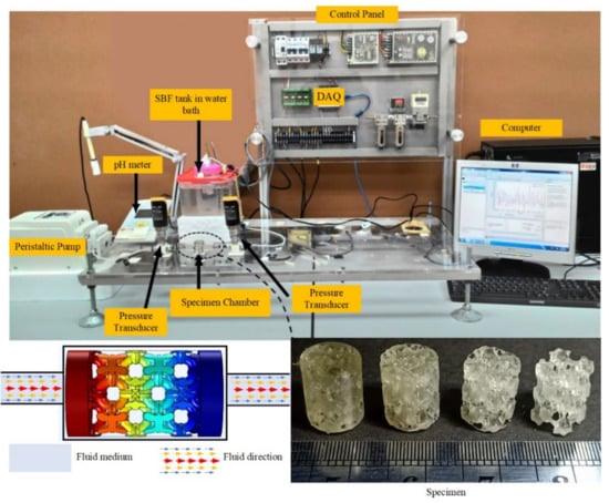 Three specimens of the NSPr1 model with a porosity of 25, 45, 60, and 65% were fabricated from polymer resins for three-dimensional stereolithography (SLA-3DP) imprinting with a resolution of 35 µm. The permeability test apparatus and the test scheme are shown in Figure 2. A peristaltic pump with a capacity of 2.16 mL/s is connected directly to the reservoir to provide continuous fluid flow. The permeability apparatus used an 8-mm inner diameter tube to connect to other equipment or sensors. The fluid flow was adjusted to 0.670 mL/min in these experiments. The value of the volumetric flow rate according to the movement of bone marrow has a flow rate range of 0.012–1.670 mL/min [24,25,26]. The mass flow rate is measured directly from the tube using an intelligent flow sensor FL0001 (EMA Electronic Ltd., New Taipei City, Taiwan). There is a specially designed chamber to hold and clamp the specimen when it is subjected to a flowing simulated body fluid (SBF). The peripheral surface of the specimen is wrapped with polytetrafluoroethylene (PTFE) tape to prevent fluid flow along the outer surface of the specimen from entering. Differential pressure is used to measure the difference in fluid pressure, whose value is used to analyze macroscopic permeability. Darcy’s law is used to calculate the permeability of the specimen. The differential pressure is measured using a pressure transducer (EMA Electronic Ltd., New Taipei City, Taiwan) with a maximum pressure of 1 bar. The USB-6009 instrument data acquisition system (DAQ) (National Instruments Company, Austin, TX, USA) was used to read, collect and store data during the test. The pressure transducer and flow rate sensor are linked to the data acquisition system of the DAQ instrument.
