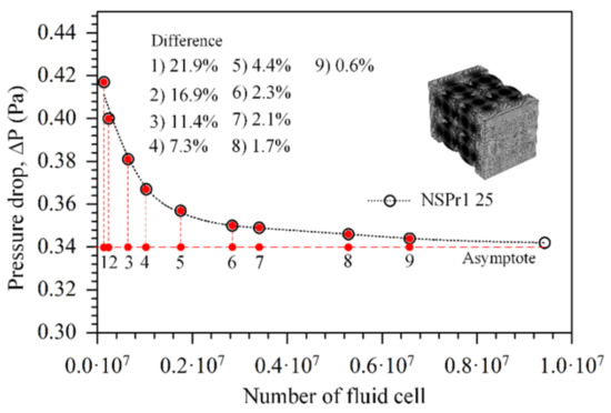 Convergence studies were carried out with at least 6 million fluid cells to achieve reliable results (see Figure 5). Since the permeability is directly proportional to the pressure drop, the pressure drop value from the study should be independent of the mesh density. The permeability value of the NSPr model, as determined by both experiment and simulation, is tabulated in Table 2. The permeability value determined through computer simulation was comparable to or near the value obtained from experimental measurements. The error in the permeability value between the simulation and experiment was 5%. Two essential explanations for this observation were: (1) experimental testing shows fluid flow tends to act as a turbulent medium. So, the simulation results based on Darcy’s law do not match the assumption of laminar flow; (2) it is well known that the simulated and generated geometries can be slightly different due to minor flaws in the 3D printing process. For example, the 3D-printed scaffold’s rough surface causes fluid friction and blocks fluid flow during experimental tests, which changes the pressure drop and permeability values [30].