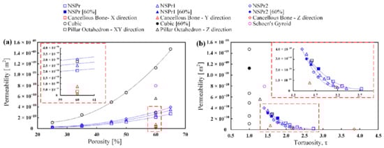 Figure 6a shows the relationship between permeability and porosity. As the porosity increases, the permeability also increases. For each model, the porosity showed a powerful correlation to the permeability with a polynomial of 2nd order R2 = 0.9. Furthermore, the permeability value of cubic scaffold was higher than that of other types of scaffolds, including natural cancellous bone. For the NSP scaffold, the permeability of the NSPr2 model was higher than that of the NSPr and NSPr1 models. An increase in porosity results in an increase in permeability. The permeability values for the NSPr, NSPr1, and NSPr2 models at 60% porosity were m2, m2, and m2, respectively. It indicates that the increase in porosity results in varying permeabilities. In addition, the permeability of the octahedron pillar model and natural cancellous bone is different in different planes despite having the same porosity.