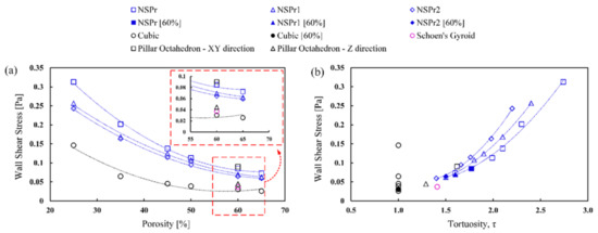 Figure 7 shows the relationship between maximum wall shear stress (WSS) and porosity and tortuosity. WSS decreased with increasing porosity and increased with increasing tortuosity. Porosity and tortuosity strongly correlate to WSS with a polynomial of 2nd order R2 = 0.9 for each model tested. The WSS value for the cubic model is lower than for other scaffolds. The WSS value of the NSPr model was higher than the NSPr1, NSPr2, and cubic models. At 60% porosity, the WSS values for the NSPr, NSPr1, and NSPr2 models were 0.084 Pa, 0.069 Pa, and 0.064 Pa, respectively. It shows that the same porosity produces different WSS.