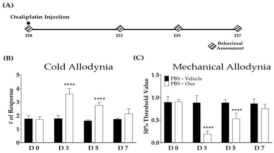The effect of a single intraperitoneal oxaliplatin injection in mice. Schedule for experiments conducted to assess the degree of the cold and mechanical forms allodynia after oxaliplatin injection (A). Cold (B) and mechanical (C) allodynia after oxaliplatin injection. N = 6 each group. Note: **** p < 0.0001 vs. vehicle with two-way ANOVA followed by Sidak’s post-test for multiple comparisons. The ANOVA test found interaction F-values of 32.8 and 28.1 for the cold and mechanical forms of allodynia, respectively.