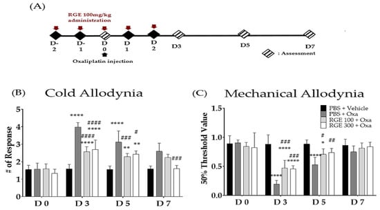 Effect of red ginseng extract (RGE) 100, 300 mg/kg on the cold and mechanical forms of allodynia induced by oxaliplatin injection in mice. The experimental schedule (A) and the effects of RGE against oxaliplatin-induced cold (B) and mechanical (C) forms of allodynia in mice. Behavioral tests to measure allodynia were performed before (D0) and after three times a day (D3, D5, D7). PBS and vehicle (5% glucose) were used as controls as they are solvents of RGE and oxaliplatin, respectively. N = 6 for each group; **** p, ####p < 0.0001, ### p < 0.001, ** p, ## p < 0.005, * p, # p < 0.05 vs. vehicle group with a two-way ANOVA followed by Sidak’s post-test for multiple comparisons. The ANOVA test found interaction F-values of 12.42 and 8.966 for the cold and mechanical forms of allodynia, respectively.
