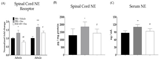 The analysis of noradrenaline receptor gene expression in the spinal cords of mice demonstrated the involvement of the spinal noradrenergic (NE) system as a mechanism of action. In our study, both spinal α1- and α2-adrenergic receptors were shown to be increased after oxaliplatin treatment and decreased after 100 mg/kg of RGE treatment. Several studies have associated an increase in spinal noradrenergic receptors with pain.