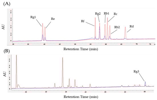 Identification and quantification of ginsenosides in RGE using HPLC. HPLC chromatograms of Rg1, Rg2, Re, Rf, Rb1, Rb2, Rc, Rd (A), and Rg3 (B). The peak in blue represents the standard and the red line represents the ginsenosides. The X-axis reports the retention time (RT) and the Y-axis reports the absorbance unit (AU).