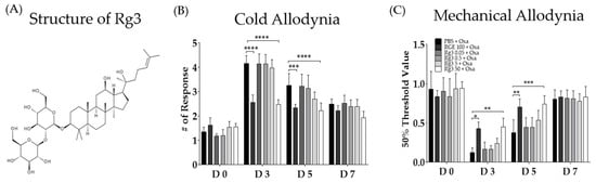Dose-dependent preventive effects of ginsenoside Rg3 on the cold and mechanical forms allodynia induced by oxaliplatin injection in mice. The chemical structure of ginsenoside Rg3 (A). Effects of ginsenoside Rg3 against oxaliplatin-induced cold (B) and mechanical (C) forms of allodynia in mice. Behavioral tests to measure allodynia were performed before (D0) and three, five, and seven days after (D3, D5, D7) a single oxaliplatin injection. PBS and vehicle were used as the controls as they are solvents of both RGE and Rg3.P N = 6 for each group; **** p < 0.0001, *** p < 0.001, ** p < 0.01, * p < 0.05 vs. vehicle group with two-way ANOVA followed by Sidak’s post-test for multiple comparisons. The ANOVA test found interaction F-values of 8.966 and 2.771 for the cold and mechanical forms allodynia, respectively.