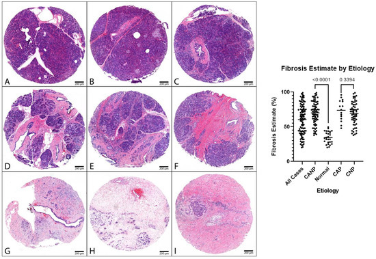 Representative cohort cases, H&E. Left: (A–C) Representative normal pancreatic tissue (NPT) with fibrosis estimates of 23%, 35%, and 44%, respectively (NPT cohort average of 34%). (D–F) Representative chronic pancreatitis tissue with fibrosis estimates of 61%, 65%, and 70%, respectively. (G–I) Representative chronic pancreatitis tissues with fibrosis estimates of 92%, 95%, and 96%, respectively. Panels (D,F,H) are cases of CNP (CNP cohort average of 69%). Panels (E,G,I) are cases of CAP (CAP cohort average of 74%): 40× magnification. (Right): Dot plot of fibrosis estimates, combined genders, with p-values displayed. H&E, hematoxylin and eosin.