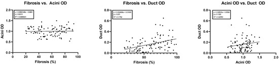 Simple linear regression showed a statistically significant correlation between the amount of fibrosis versus duct OD (y = 0.002499x + 0.0160; 95% confidence interval of slope 0.001404 to 0.003594; p < 0.05, R2 = 0.18). No correlation was noted between acini OD versus duct OD (p = 0.13) or the amount of fibrosis versus acini OD (p = 0.81). The results of these regression studies are shown in Figure 4.