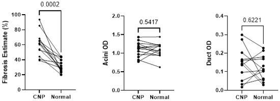 Wilcoxon testing of the 13 cases with representation of both CNP and NPT showed statistically significant differences in fibrosis present within the matched pairs (p < 0.05), as shown in Figure 5, however, no statistically significant differences were seen between acini and duct OD.