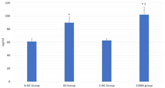 Corticosterone plasma levels after the AS and CUMS versus control. The asterisk represents statistical differences versus control (p < 0.05). † denotes the significant difference between CUMS and AS groups (p < 0.01).