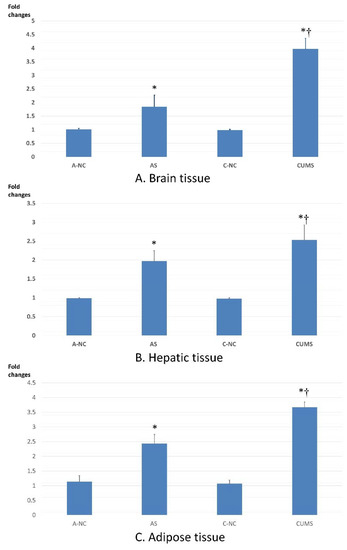 Fold changes in Enho gene expression in the brain (A), liver (B), and adipose tissue (C) of all studied groups. * represents significant differences versus the equivalent control, † denotes significant differences between CUMS and AS groups (p < 0.05).