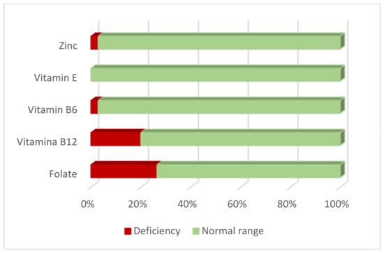 p = 0.08) levels increased in comparison to T0. Finally, at T1, we observed a reduction in the percentage of patients with B12 vitamin deficit (20% at T0 vs. 5.9% at T1), whereas all women with folate deficit had already corrected this condition.