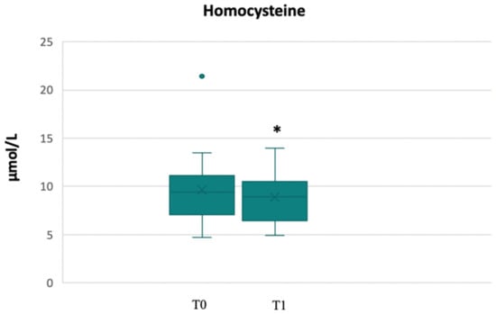 A reduction in homocysteine levels from T0 to T1 (9 μmol/L vs. 7.9 μmol/L,