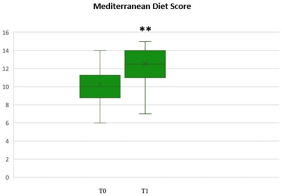 Through the analysis of the Mediterranean Diet adherence score at the end of the first phase, we found a statistically significant increase in the median adherence score (T0 vs. T1,