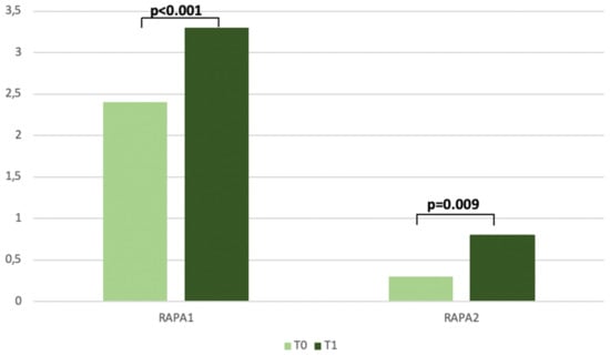 p = 0.009). Regarding the patients who concluded the study, RAPA 1 and RAPA 2 significantly increased from T0 to T2 (
