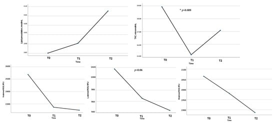 Figure 4), which was still significantly higher at T2, with a median value of 13 (8–15) (T0 vs. T2,