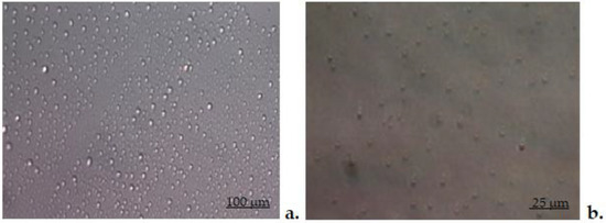 The confirmation of coating of vesicles was given, on the one hand, by the Zeta potential, which showed that the electric charge on the vesicles’ surface changed and became positive, and on the other hand, by the modification in the morphology of the vesicles covered with chitosan, highlighted in the DIC optical microscopy images. The first DIC image obtained at a magnitude of 40× revealed the lipid vesicles loaded with DCF with a non-uniform distribution position, appearing as drops adhering to the surface of the glass support. In the second DIC image, taken with the objective set at 60×, the vesicles coated with chitosan showed a uniform distribution, as strongly hydrophobic drops on the glass support.