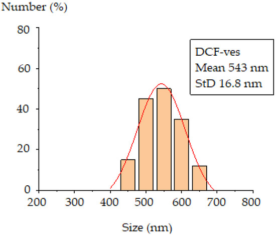 From the dimensional histogram obtained, an average size of 543 ± 10.17 nm results for DCF-ves covered with chitosan, which is in accordance with the hydrodynamic size obtained by DLS assessed with the Malvern device (Figure 4).