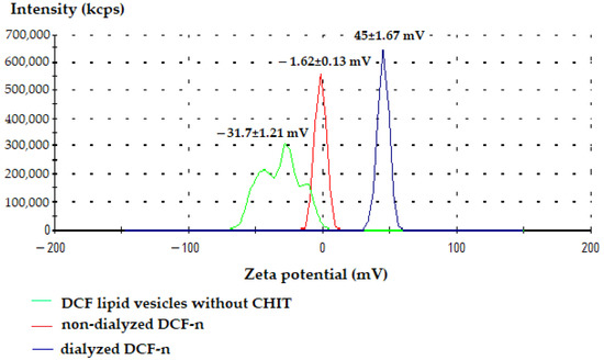 According to the stability criteria of colloidal dispersions, we can state that the lipid vesicles loaded with DCF showed a moderate stability (objectified by the value of −31.7 ± 1.21 mV of Zeta potential), due to strong rejections that appear between the vesicles loaded with negative charges. The addition of chitosan to the negatively charged vesicle surface caused attraction of positively charged chitosan chains. This led to a Zeta potential of 45 ± 1.67 mV of the colloidal dispersion, an indicator of good stability (Figure 5).