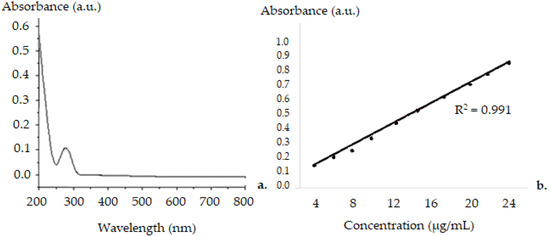 UV–vis Spectra for DCF in suspension (a) and calibration curve (b).