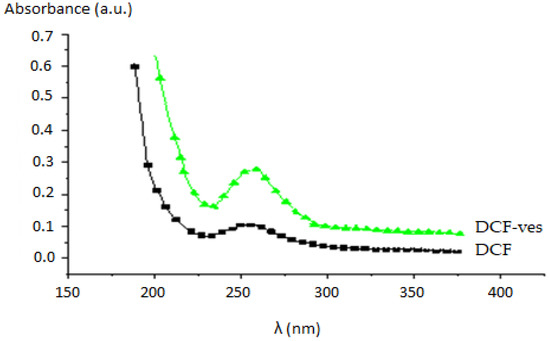 The series of values for each absorbance determination were taken and analyzed using HP ChemStation software (Agilent, Santa Clara, CA, USA). The dissolution profile of DCF released from DCF-ves was compared with that obtained for DCF solution (1 mg/mL), similar to that existing in 10 mL DCF-ves, using the same spectrophotometric method of determination.