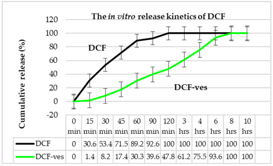 The stability of DCF-ves does not seem to depend on the size of the lipid vesicles but rather on the molecular weight of the drug and the chitosan surrounding the vesicle. The study of the in vitro release profile revealed slower kinetics of DCF from chitosan-coated lipid microsystems compared to the release of this drug from DCF solution. The sustained release of this NSAID from DCF-ves can be attributed to the high dispersion of the active substance as isolated molecules well-entrapped in chitosan-stabilized vesicles.
