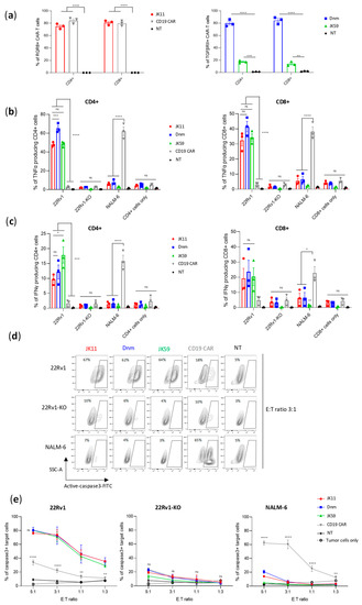 T cells were activated with anti-CD3/CD28 antibodies and cultured with 100 IU/mL rhIL-2 for 2 days. Activated T cells were transduced with CAR retroviral supernatants on 24-well plates pre-coated with Retronectin (Takara Bio, Göteborg, Sweden, T100B-TAK). For JK11, JK15, CD19 CAR, and Dnm-CAR transductions, 0.3 × 106 of activated T cells, resuspended in 1 mL of culture media supplemented with 200 IU/mL rhIL-2, were infected with 1 mL of retroviral supernatants, centrifuged at 900× g for 60 min at 32 °C and incubated at 37 °C. Then, 2 days later, 1 mL of media was replaced with fresh media supplemented with 100 IU/mL rhIL-2, and transduced T cells were expanded for 4 more days. For JK59 and JK69 CAR transductions, 500 µL of retroviral supernatant was added on Retronectin-coated plates, centrifuged at 2000 g for 60 min at 32 °C, removed, and then 0.3 × 106 of activated T cells were added on the plates and infected as described for the other CARs. Then, 24 h later, the media was removed completely, and the same transduction method was performed 1 more time before media refreshment and expansion of CAR T cells. The expanded CAR T cells were frozen and stored in liquid N2. Before the functional assays, T cells were thawed and re-activated for 2 days with anti-CD3 and anti-CD28 antibodies and with 100 IU/mL rhIL-2. Alternatively, where noted, freshly transduced T cells were used directly for experiments.