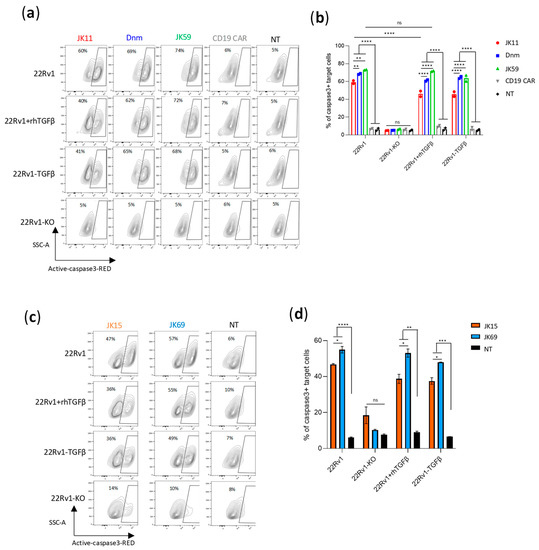 Figure 3a,b). The experiment demonstrated that all three STEAP1 CAR T cells killed target cells in a STEAP1-dependent manner, even in the presence of TGFβ. The JK59 CAR and Dnm-CAR gave significantly higher levels of killing compared to the parent JK11 CAR. This difference was more prominent for the 22Rv1 cell line overexpressing TGFβ (22Rv1-TGFβ), as compared to wild-type 22Rv1 cells, and for the cultures supplemented with rhTGFβ. For the JK11 CAR, the observed level of killing was lower in the cultures that contained TGFβ. The results were, thus, consistent with the hypothesis that the JK59 CAR T cells have superior functionality in a TGFβ-rich environment. A similar pattern was observed for the STEAP1 CAR with an IgG-based spacer. The JK69 CAR conferred T cells with a higher cytotoxic activity than the parent JK15 CAR, and the difference appeared most prominent for TGFβ-rich cultures (