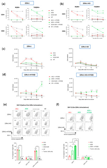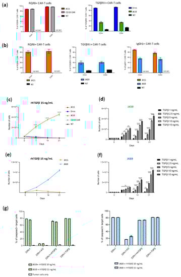Figure 5a,b). Cell counts from cultures without supplemented rhTGFβ showed that the JK11 and JK59 CAR T cells survived until the end of the experiment, while the NT and CD19 CAR T controls did not (