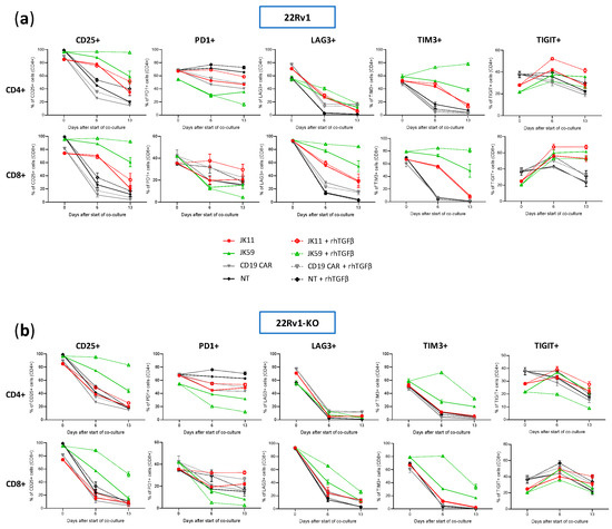 Figure 7a,b). After repeated stimulations, the JK11 CAR T cells expressed less CD25, LAG3, TIM3, and TIGIT, whereas their PD-1 level was relatively stable. In contrast, the JK59 CAR T cells supplemented with TGFβ gradually expressed less PD-1 but remained mostly CD25