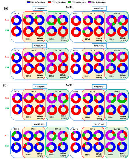 + JK11 CAR T cells had this phenotype. The proportions of single cells co-expressing CD25 with LAG3, TIGIT, or TIM3 were also considerably higher in the JK59 CAR T cells. After 13 days of culture with 22Rv1-TGFβ, 77%/82% of CD4