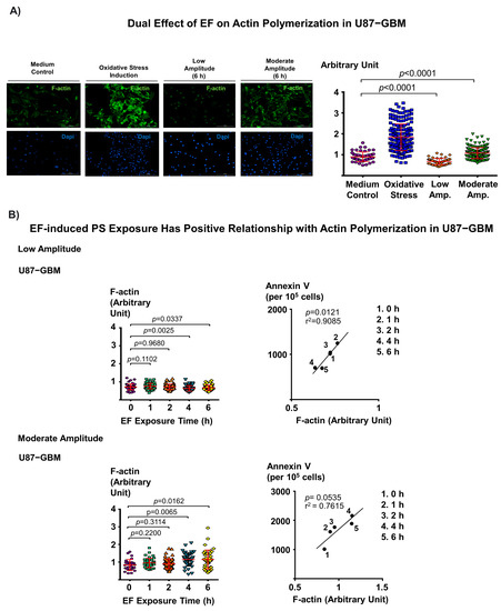 3.4. Dual Effect of Electric Field on F-Actin Polymerization and Corresponding EF-Induced PS Exposure in Cancer Cells Provide Mechanistic Insight into EF-Mediated PS Regulation