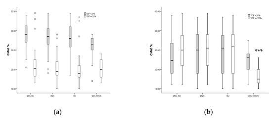 The neat semen samples we compared with prepared sperm in all four groups, separated further into two cohorts of SDF ≤20 and >20%, showed significant (p < 0.01) improvement in mature sperm selection (CMA3+%) post-preparation when compared with the pre-preparation measurements. This improvement was greater for DGC-MACS in both the SDF ≤20% (z = −4.92, p < 0.00) and SDF >20% (z = −6.4, p < 0.00) cohorts compared to all other preparation techniques. Similarly, CMA3+ % values in the SDF levels ≤20% cohort treated with DGC-MACS showed 18.4 ± 5 post-preparation; the DGC group showed 30.53 ± 10.1; the SU group showed 27.7 ± 12; the DGC-SU group showed 30.1 ± 10.6. CMA3+ % levels after DGC-MACS preparation were statistically significantly (p = 0.00) lower in the SDF ≤ 20% cohort, whereas in the SDF >20% cohort, the CMA3+ % levels were as follows: DGC-MACS, 24.5 ± 8; DGC, 28.9 ± 10.8; SU, 28.4 ± 10.4; DGC-SU; 26.06 ± 9.98. In these groups, we found no significant difference between pre- and post-preparation (p = 0.06). It is clear from the box-and-whisker plot in Figure 1 that the DGC-MACS group showed a significant reduction in the population of chromatin de-condensed (CMA3+ %) spermatozoa or immature sperm in samples with ≤20% SDF.