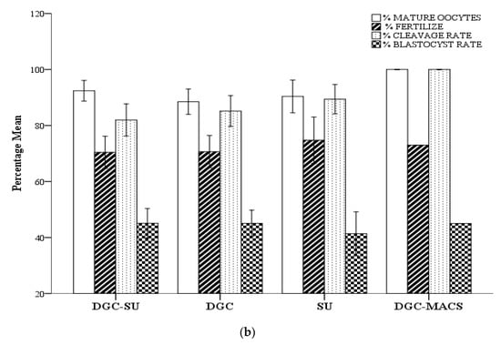 The DGC-MACS group had significantly (p < 0.01) improved cleavage rates in both SDF was ≤20% and >20% cohorts, whereas there was no difference in the live implantation rate in both SDF cohorts (Table 5, Figure 3).