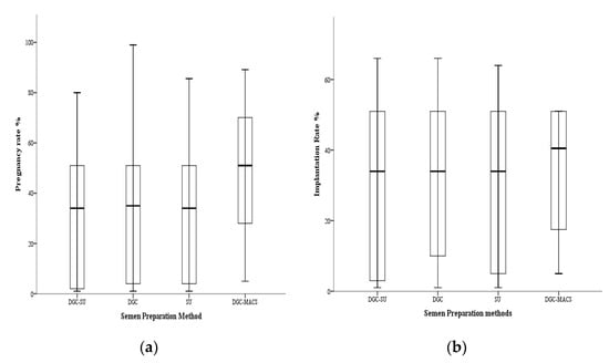 Box plot showing clinical (a) pregnancy rate and (b) implantation rate in couples in which semen preparation was done using the DGC-SU, DGC, SU and DGC-MACS methods.