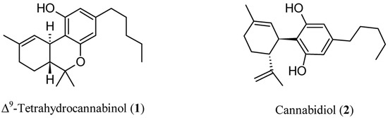 Chemical structures of Δ9-tetrahydrocannabinol (THC, 1) and cannabidiol (CBD, 2).